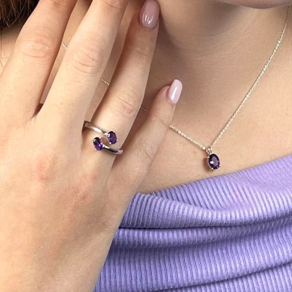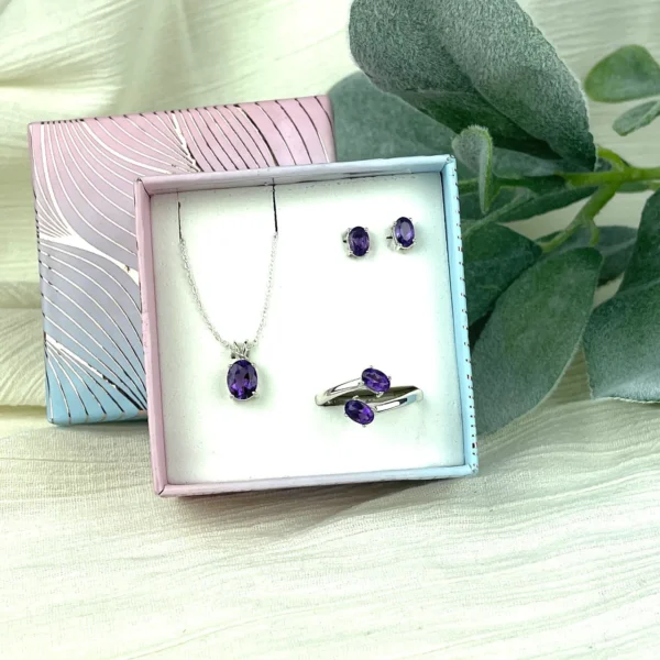 Amethyst is known as the “Queen of Crystals” and is one of the most sought-after jewelry crystals. This beautifully packaged gift set of natural Amethyst faceted into stud earrings, an adjustable double stone ring, and a gorgeous pendant is a triple protection amulet and a fashion statement. Your set is custom-made for Bliss Crystals in .925 Sterling Silver with the natural Amethyst faceted into an oval shape. When cared for properly, this jewelry can last a lifetime.